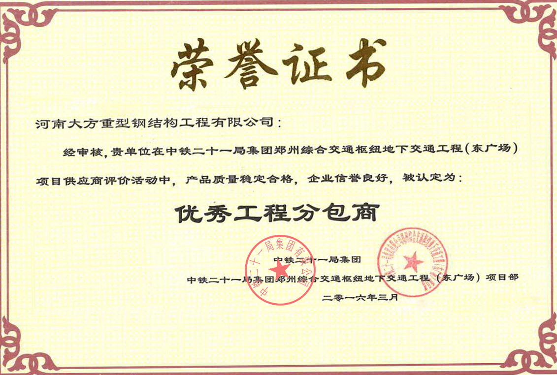 近日,從中鐵二十一局傳來喜訊,在鄭州綜合交通樞紐地下交通工程(東廣場)項目分包商評估活動中,河南大方重型鋼結(jié)構(gòu)工程有限公司因產(chǎn)品質(zhì)量穩(wěn)定合格、交付及時,企業(yè)信譽(yù)良好,提供優(yōu)質(zhì)服務(wù)被認(rèn)定為“優(yōu)秀工程分包商”。此項榮譽(yù)的獲得肯定了大方鋼構(gòu)在鄭州綜合交通樞紐地下交通工程(東廣場)項目中做出的積極貢獻(xiàn),也充分證明了中鐵二十一局集團(tuán)對大方鋼構(gòu)公司的信任。